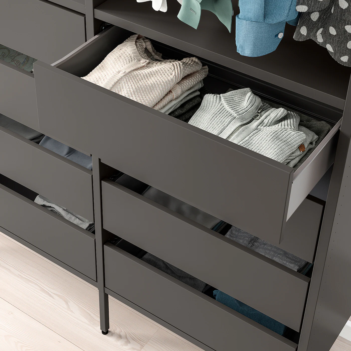 You can combine open and closed storage – shelves for your favorite things and drawers for the things you want to store away. Adjustable shelves and clothes rail make it easy for you to customize the space according to your needs. The long leg creates a beautiful look and is perfect if you have a high plinth at home. Adjustable feet make it possible to compensate for any irregularities in the floor.Material