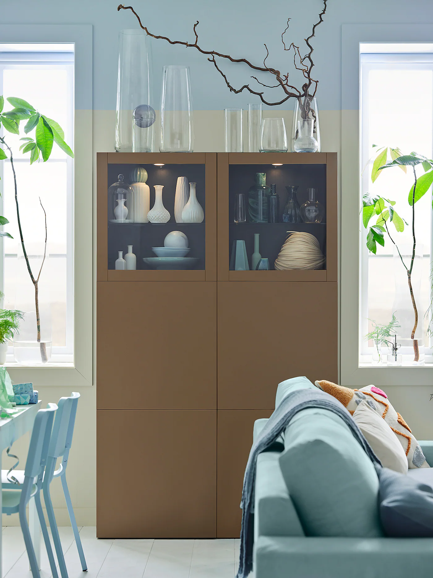 Glass doors keep your items free from dust but still visible. The shelves are adjustable so you can customize your storage as needed. You can choose to use either the soft-closing or push-open function. The push-opener lets you open the doors with just a light push, while the soft-closing hinges makes sure they close silently and softly. Adjustable hinges allow you to adjust the door horizontally and vertically. Optimize and organize your BESTÅ storage with boxes and inserts that you like.Material