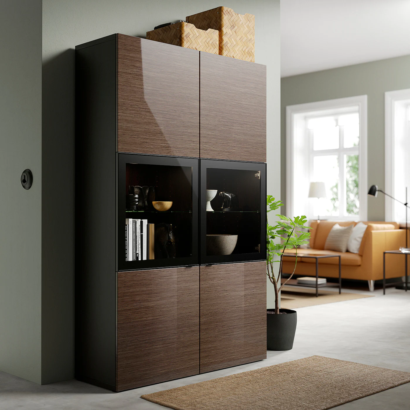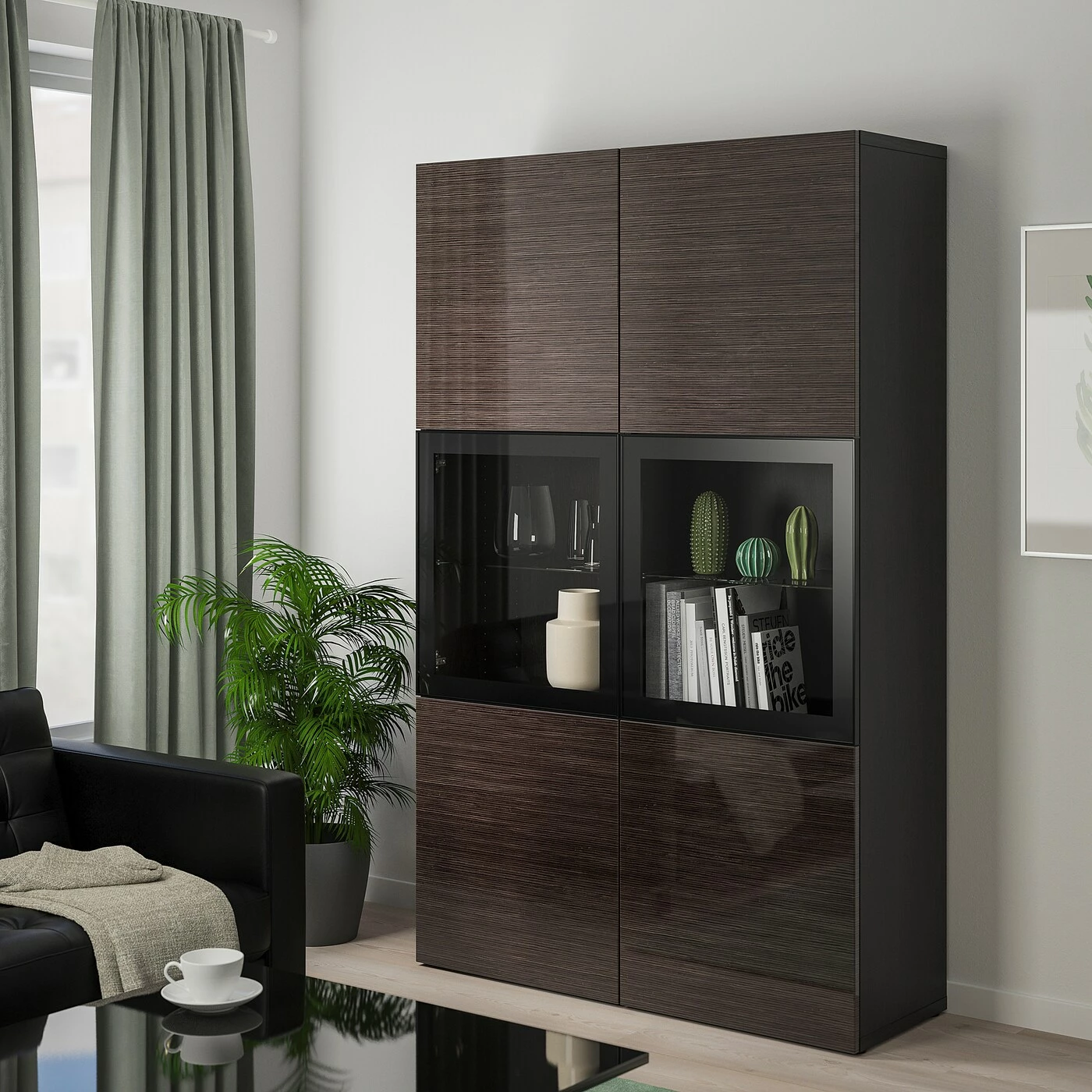 Glass doors keep your items free from dust but still visible. The shelves are adjustable so you can customize your storage as needed. You can choose to use either the soft-closing or push-open function. The push-opener lets you open the doors with just a light push, while the soft-closing hinges makes sure they close silently and softly. Adjustable hinges allow you to adjust the door horizontally and vertically. Optimize and organize your BESTÃ… storage with boxes and inserts that you like.Material