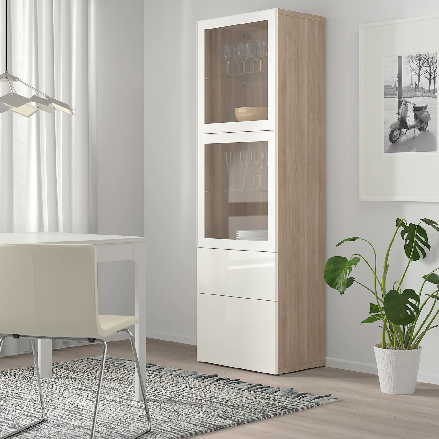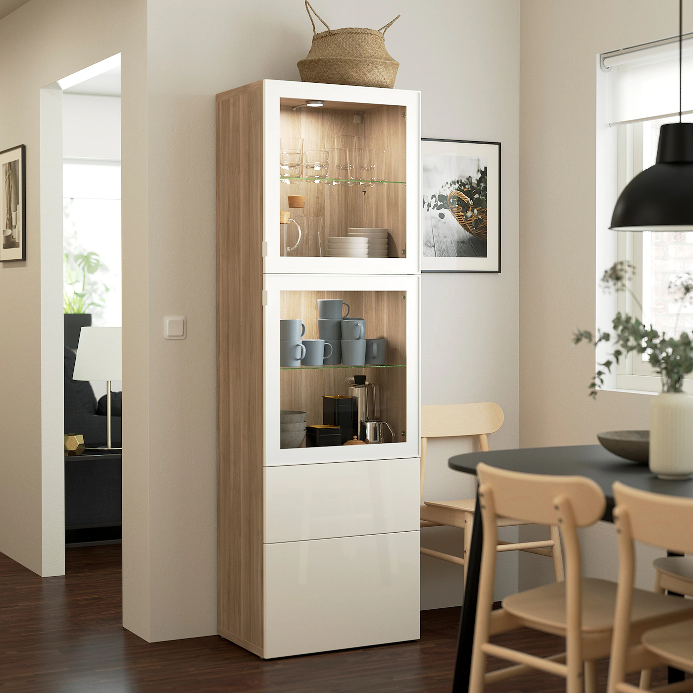 Glass doors keep your items free from dust but still visible. Adjustable hinges allow you to adjust the door horizontally and vertically. The glass shelves are adjustable so you can customize your storage as needed. Two drawers make it easy to keep your belongings organized. The shelves behind the doors give you even more storage space.Material