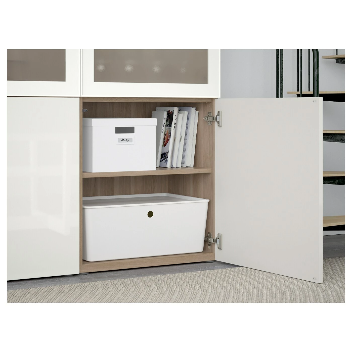 Glass doors keep your items free from dust but still visible. The shelves are adjustable so you can customize your storage as needed. You can choose to use either the soft-closing or push-open function. The push-opener lets you open the doors with just a light push, while the soft-closing hinges makes sure they close silently and softly. Adjustable hinges allow you to adjust the door horizontally and vertically. Optimize and organize your BESTÅ storage with boxes and inserts that you like.Material