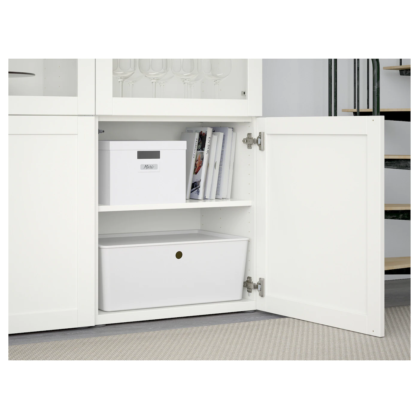 Glass doors keep your items free from dust but still visible. The shelves are adjustable so you can customize your storage as needed. You can choose to use either the soft-closing or push-open function. The push-opener lets you open the doors with just a light push, while the soft-closing hinges makes sure they close silently and softly. Adjustable hinges allow you to adjust the door horizontally and vertically. Optimize and organize your BESTÅ storage with boxes and inserts that you like.Material
