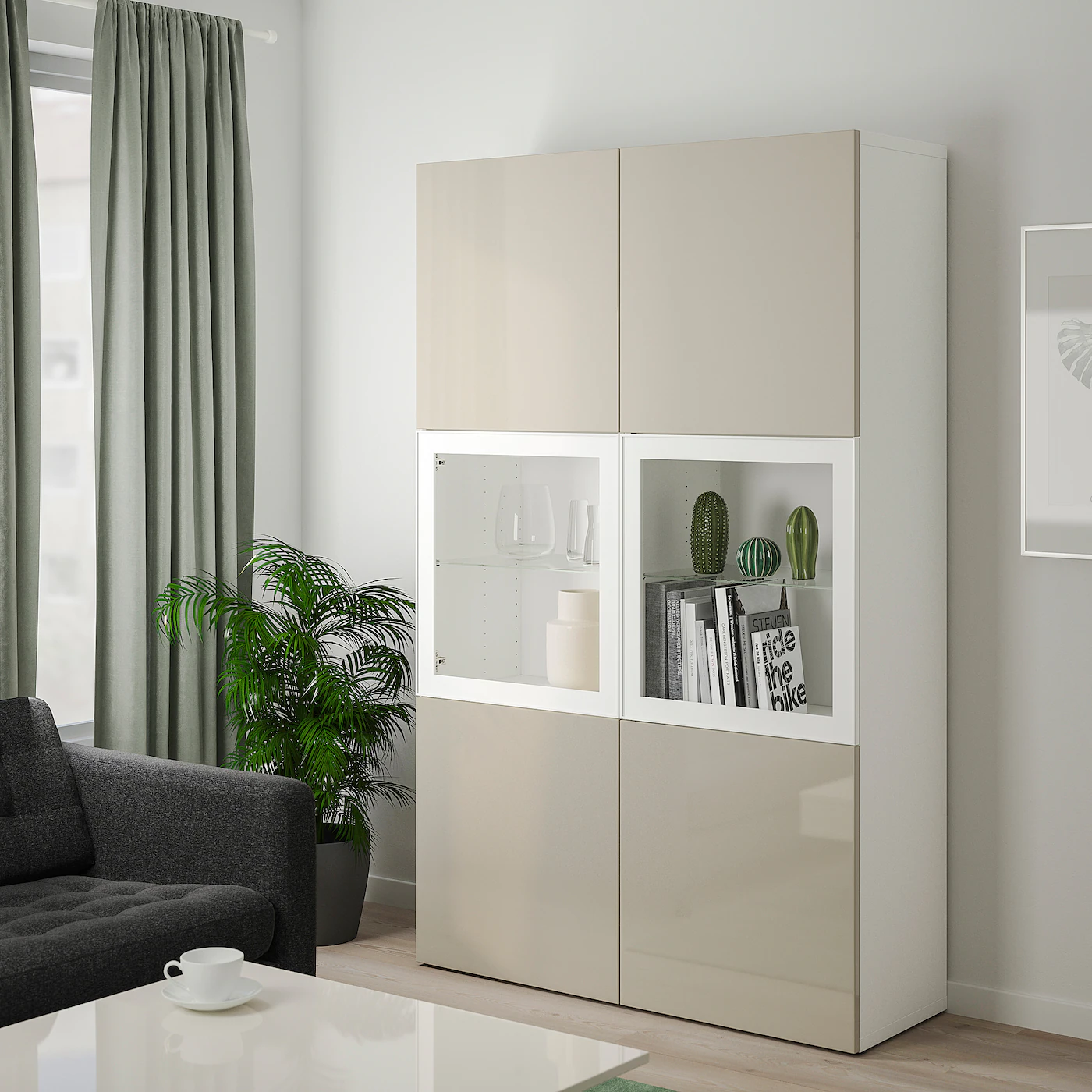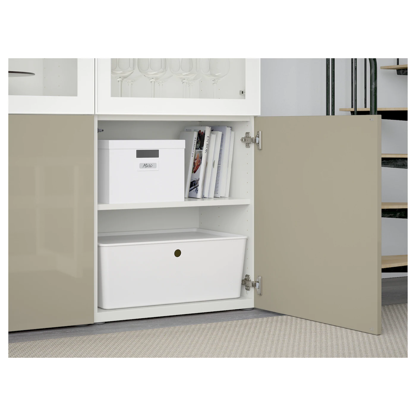 Glass doors keep your items free from dust but still visible. The shelves are adjustable so you can customize your storage as needed. You can choose to use either the soft-closing or push-open function. The push-opener lets you open the doors with just a light push, while the soft-closing hinges makes sure they close silently and softly. Adjustable hinges allow you to adjust the door horizontally and vertically. Optimize and organize your BESTÅ storage with boxes and inserts that you like.Material