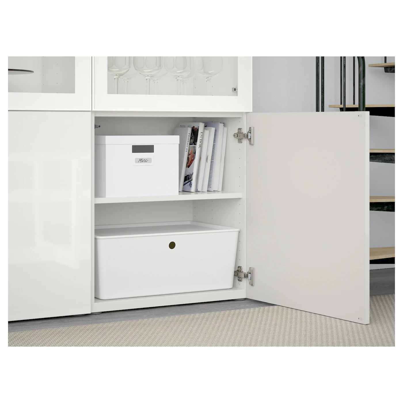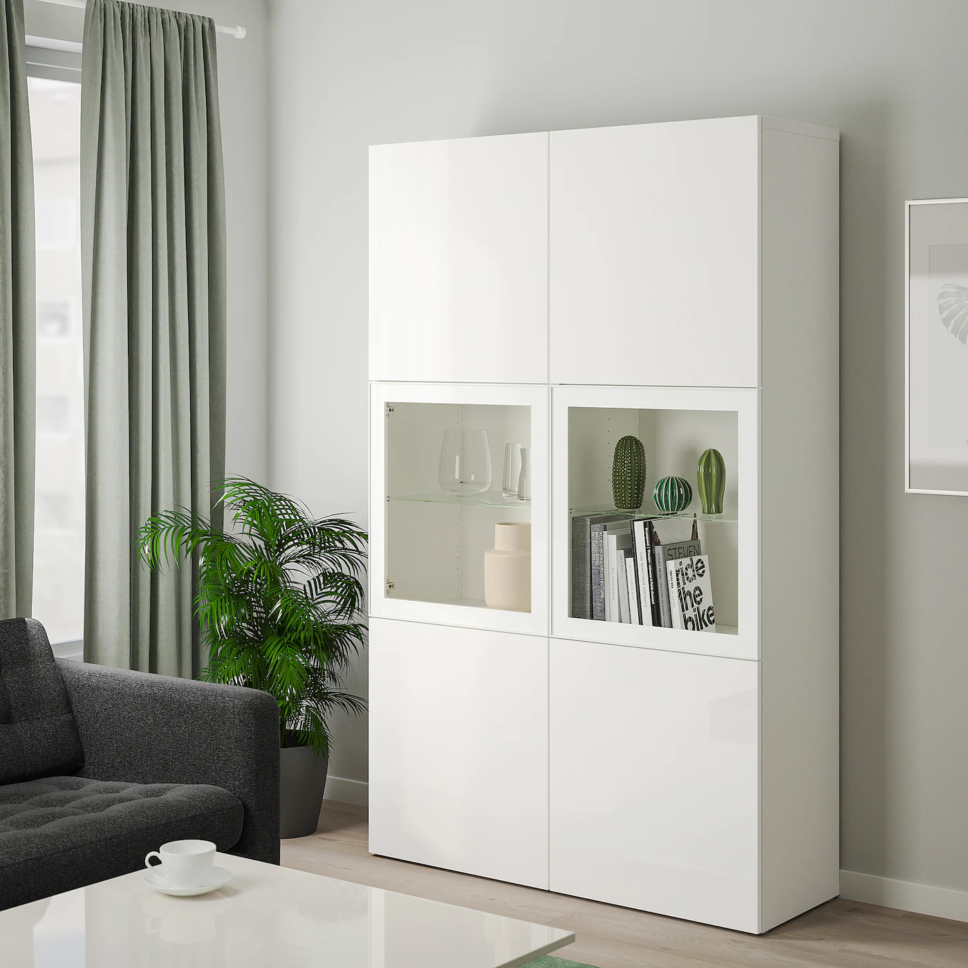 Glass doors keep your items free from dust but still visible. The shelves are adjustable so you can customize your storage as needed. You can choose to use either the soft-closing or push-open function. The push-opener lets you open the doors with just a light push, while the soft-closing hinges makes sure they close silently and softly. Adjustable hinges allow you to adjust the door horizontally and vertically. Optimize and organize your BESTÅ storage with boxes and inserts that you like.Material