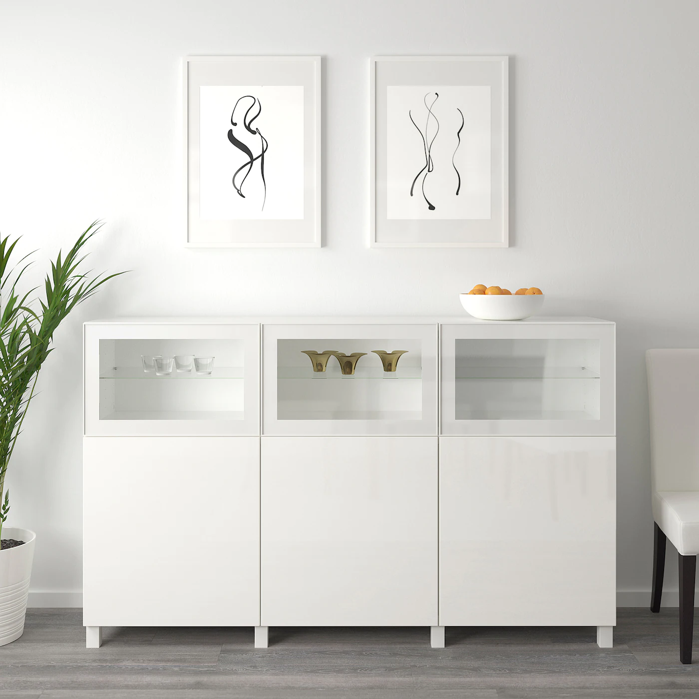 The doors open with a light push and close silently and softly, as the hinges have both push-open and soft-closing functions. The shelves are adjustable so you can customize your storage as needed. You can choose to use either the soft-closing or push-open function. Adjustable hinges allow you to adjust the door horizontally and vertically. Optimize and organize your BESTÅ storage with boxes and inserts that you like.Material