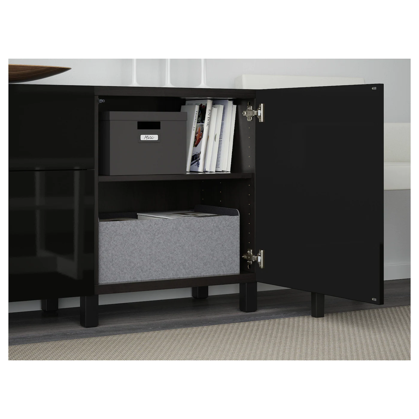 The drawers and doors close silently and softly, thanks to the integrated soft-closing function. The shelves are adjustable so you can customize your storage as needed. Two drawers make it easy to keep your belongings organized. The shelves behind the doors give you even more storage space. Optimize and organize your BESTÅ storage with boxes and inserts that you like.Material