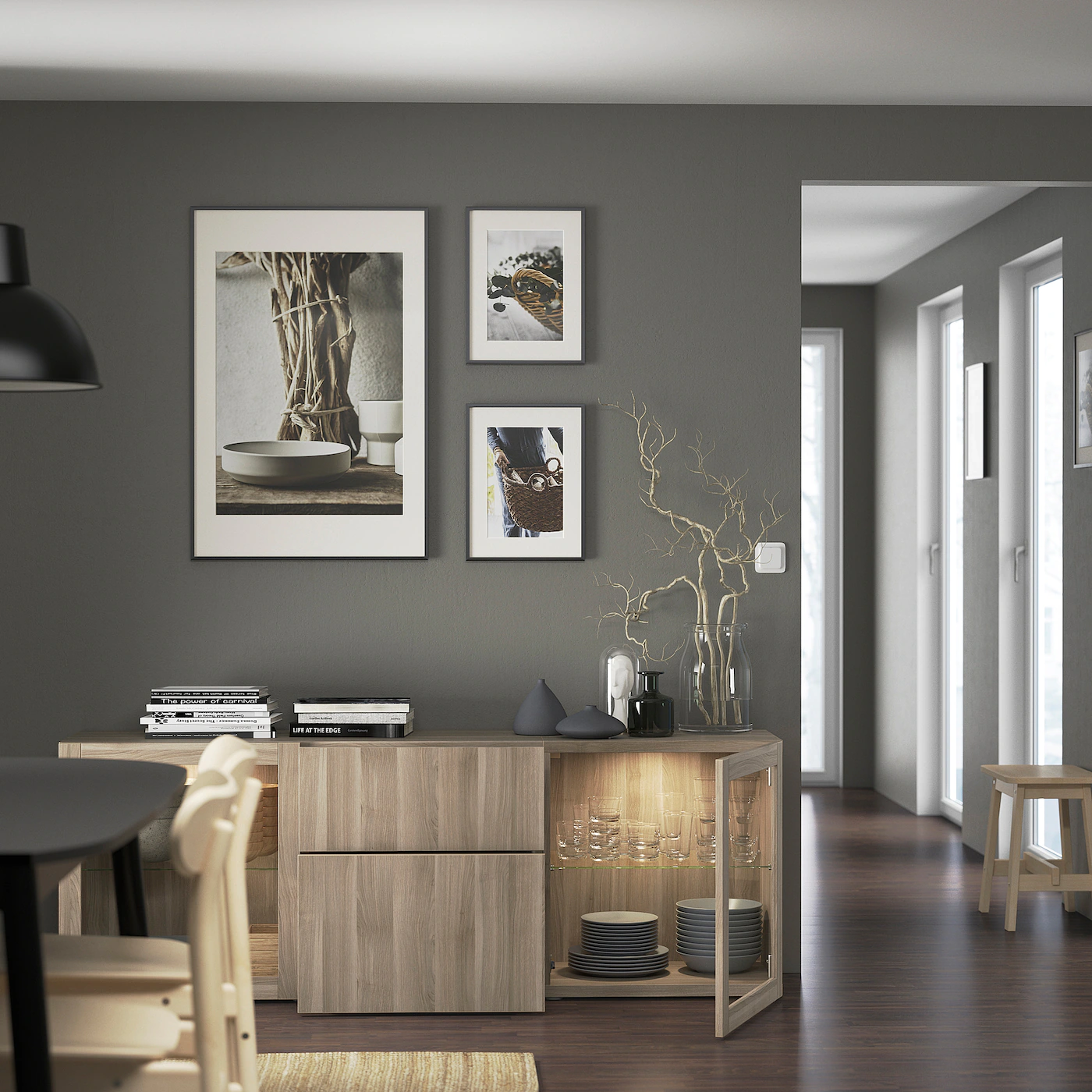 The drawers and doors close silently and softly, thanks to the integrated soft-closing function. The shelves are adjustable so you can customize your storage as needed. Two drawers make it easy to keep your belongings organized. The shelves behind the doors give you even more storage space. Optimize and organize your BESTÅ storage with boxes and inserts that you like. Steady on uneven floors, thanks to the adjustable feet.Material