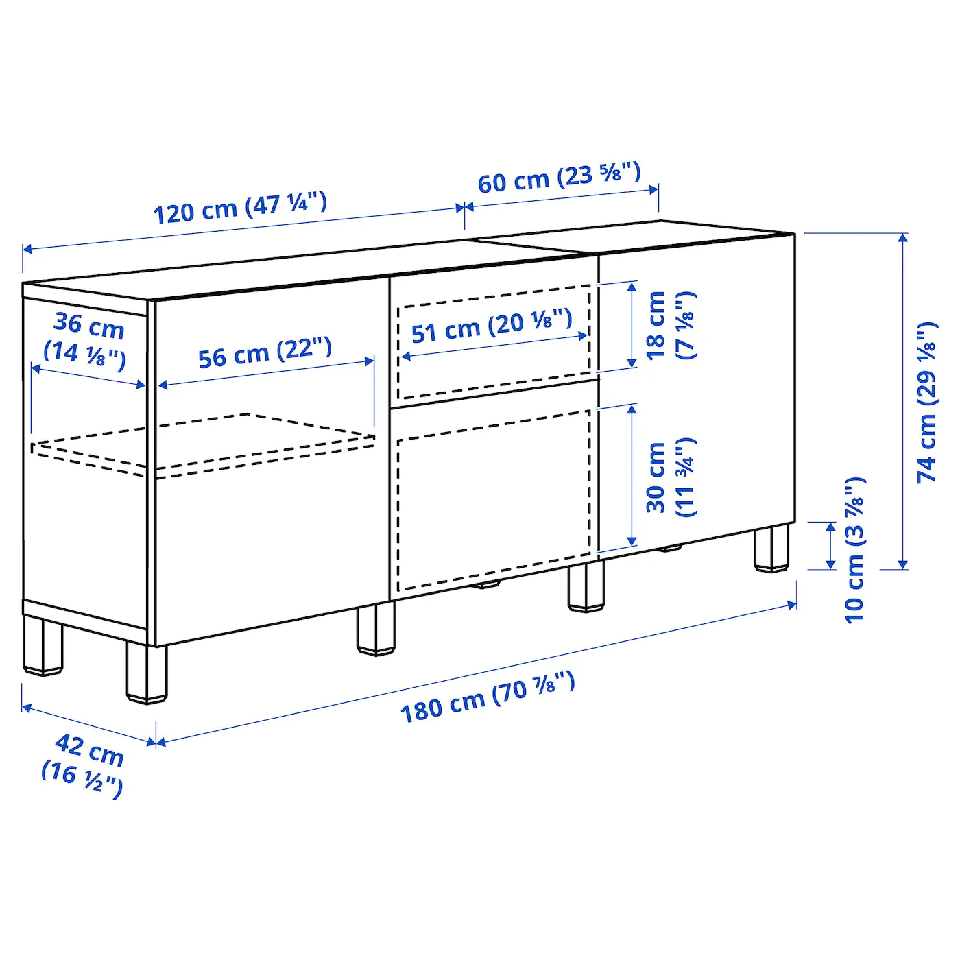 The drawers and doors close silently and softly, thanks to the integrated soft-closing function. The shelves are adjustable so you can customize your storage as needed. Two drawers make it easy to keep your belongings organized. The shelves behind the doors give you even more storage space. Optimize and organize your BESTÅ storage with boxes and inserts that you like.Material