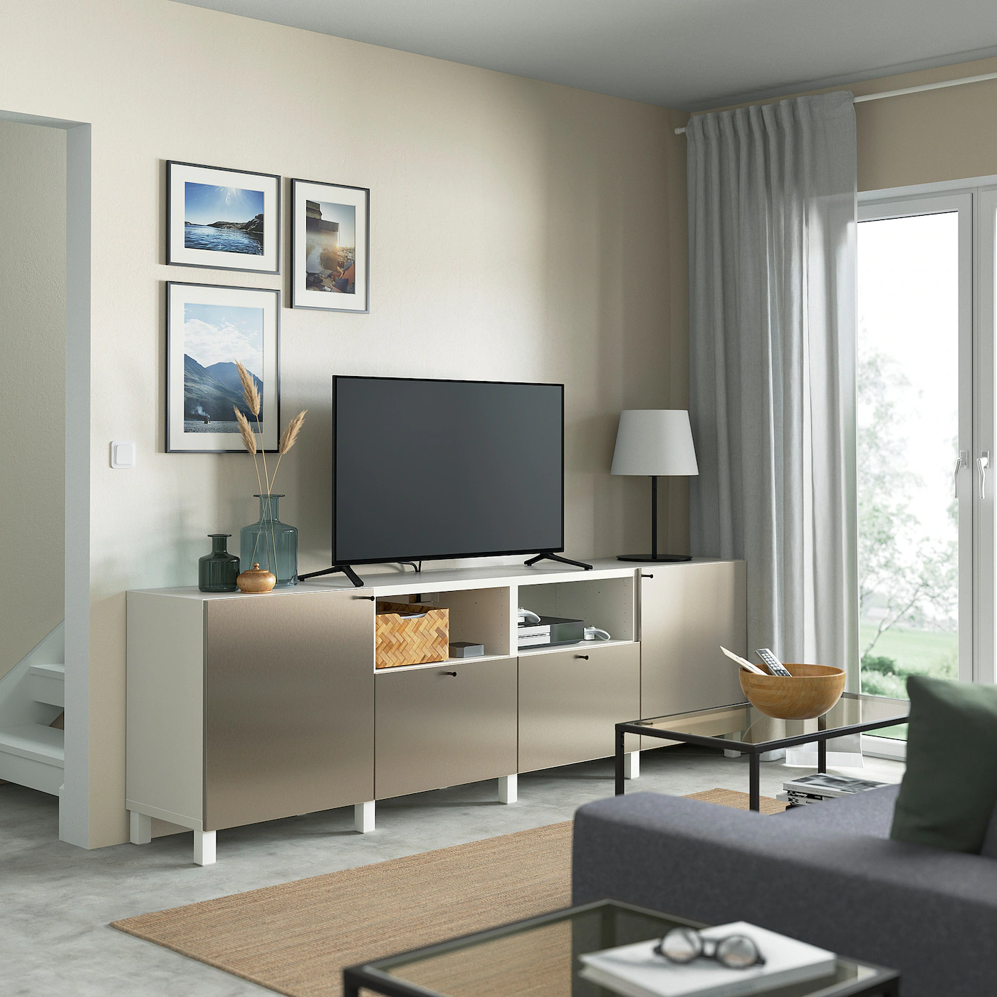 The cable outlet at the top lets cords run down smoothly into the TV bench. It’s easy to keep the cords from your TV and other devices out of sight but close at hand, as there are several cord outlets at the back of the TV bench. The drawers and doors close silently and softly, thanks to the integrated soft-closing function. The two drawers make it easy to keep remote controls, game controls and other TV accessories organized. The shelves are adjustable so you can customize your storage as needed. Optimize and organize your BESTÅ storage with boxes and inserts that you like.Material