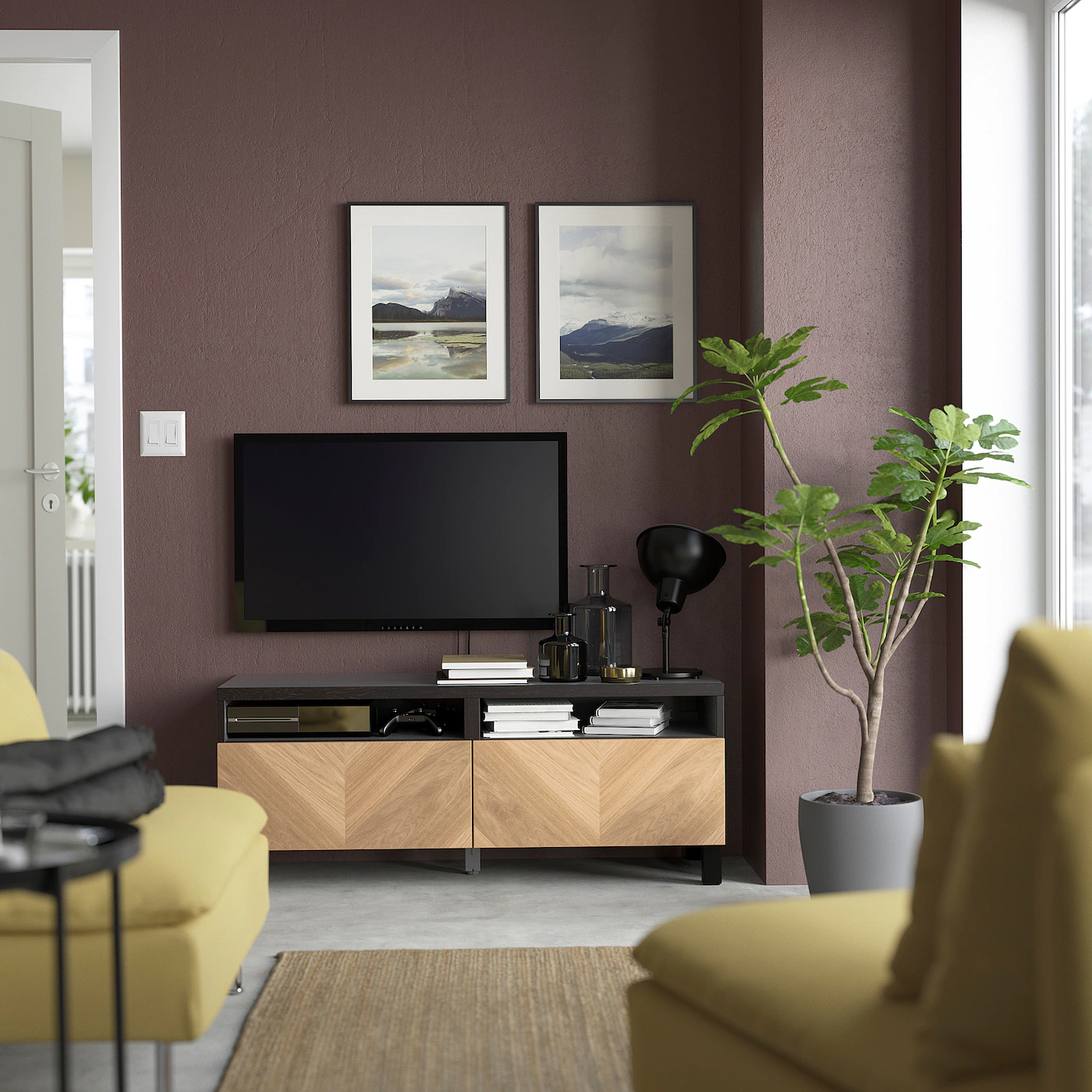 It’s easy to keep the cords from your TV and other devices out of sight but close at hand, as there are several cord outlets at the back of the TV bench. The cable outlet at the top lets cords run down smoothly into the TV bench. The legs raise your BESTÅ combination from the floor, giving it a light airy look and making it easy to clean the floor underneath. The two drawers make it easy to keep remote controls, game controls and other TV accessories organized. The drawer has an integrated push-opener, so you don’t need handles or knobs and it will open with just a light push. The drawer runners are adjustable so you can adjust the front both horizontally and in depth.Material