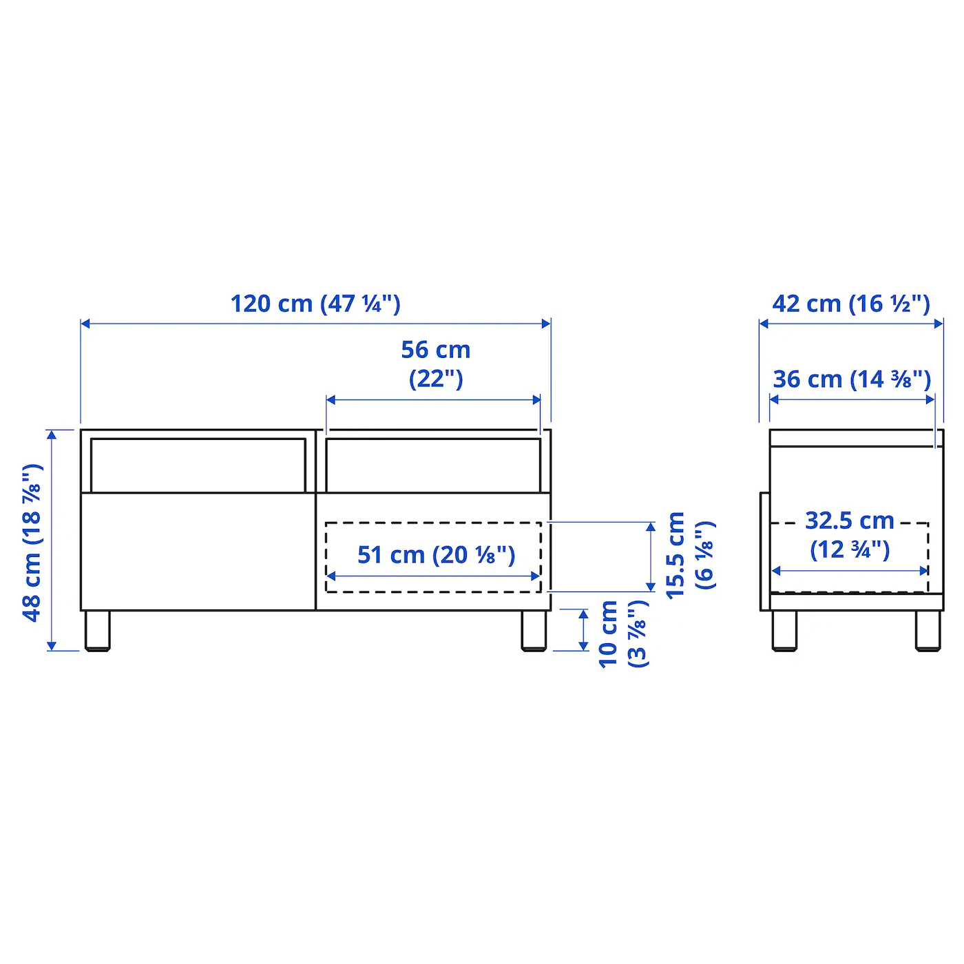 It’s easy to keep the cords from your TV and other devices out of sight but close at hand, as there are several cord outlets at the back of the TV bench. The cable outlet at the top lets cords run down smoothly into the TV bench. The legs raise your BESTÅ combination from the floor, giving it a light airy look and making it easy to clean the floor underneath. The two drawers make it easy to keep remote controls, game controls and other TV accessories organized. The drawer has an integrated push-opener, so you don’t need handles or knobs and it will open with just a light push. The drawer runners are adjustable so you can adjust the front both horizontally and in depth.Material