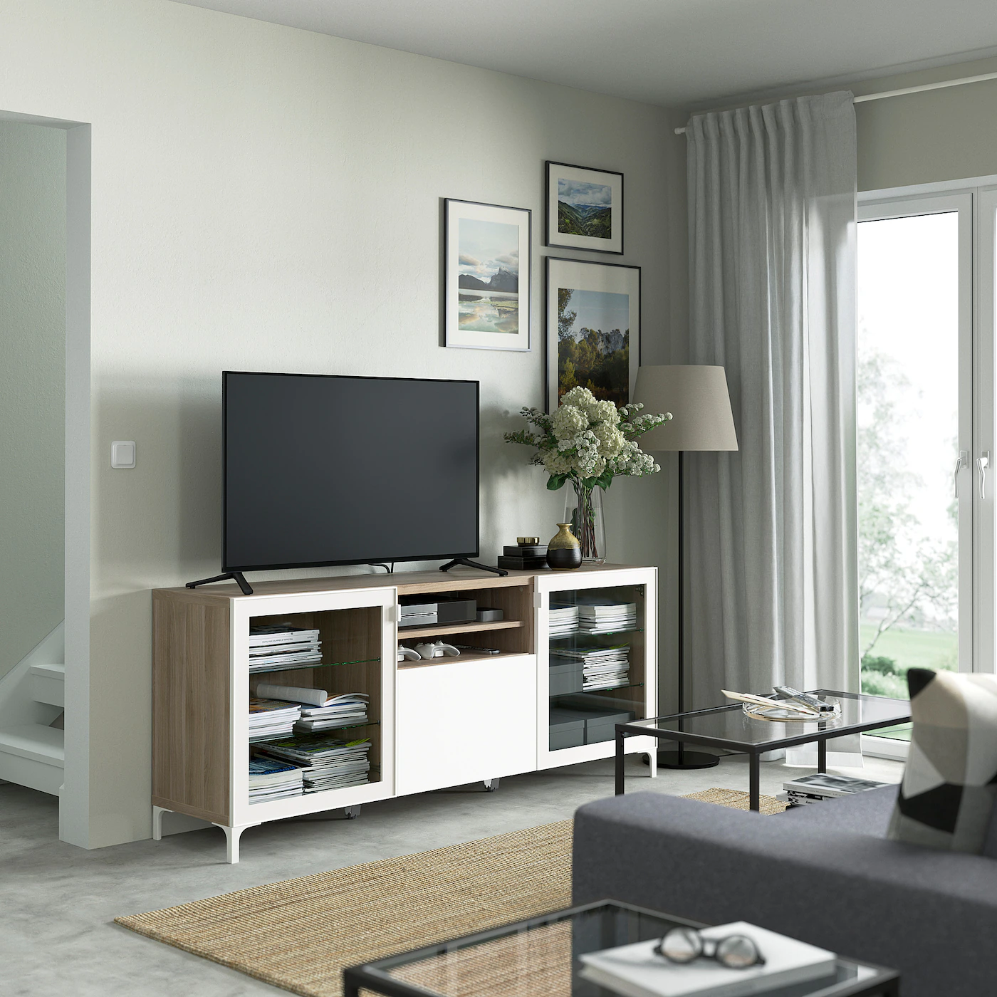 The cable outlet at the top lets cords run down smoothly into the TV bench. The drawer has an integrated push-opener, so you don’t need handles or knobs and it will open with just a light push. The drawer runners are adjustable so you can adjust the front both horizontally and in depth. The shelves are adjustable so you can customize your storage as needed. Optimize and organize your BESTÅ storage with boxes and inserts that you like. A remote control will work through the glass; control your equiptment with the door closed.Material
