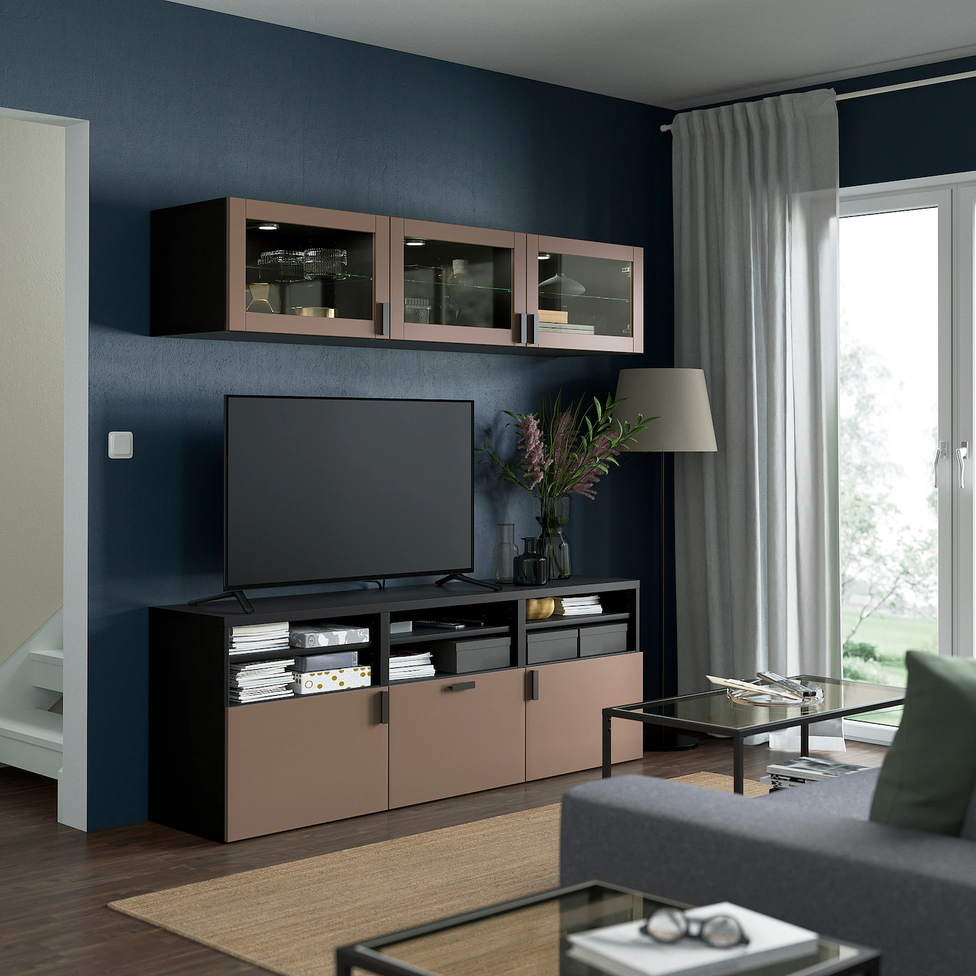 It’s easy to keep the cords from your TV and other devices out of sight but close at hand, as there are several cord outlets at the back of the TV bench. The cable outlet at the top lets cords run down smoothly into the TV bench. The drawer closes silently and softly, thanks to the integrated soft-closing function. The shelves are adjustable so you can customize your storage as needed. The space-saving wall cabinets make the most of the wall area above your TV. Optimize and organize your BESTÅ storage with boxes and inserts that you like.Material