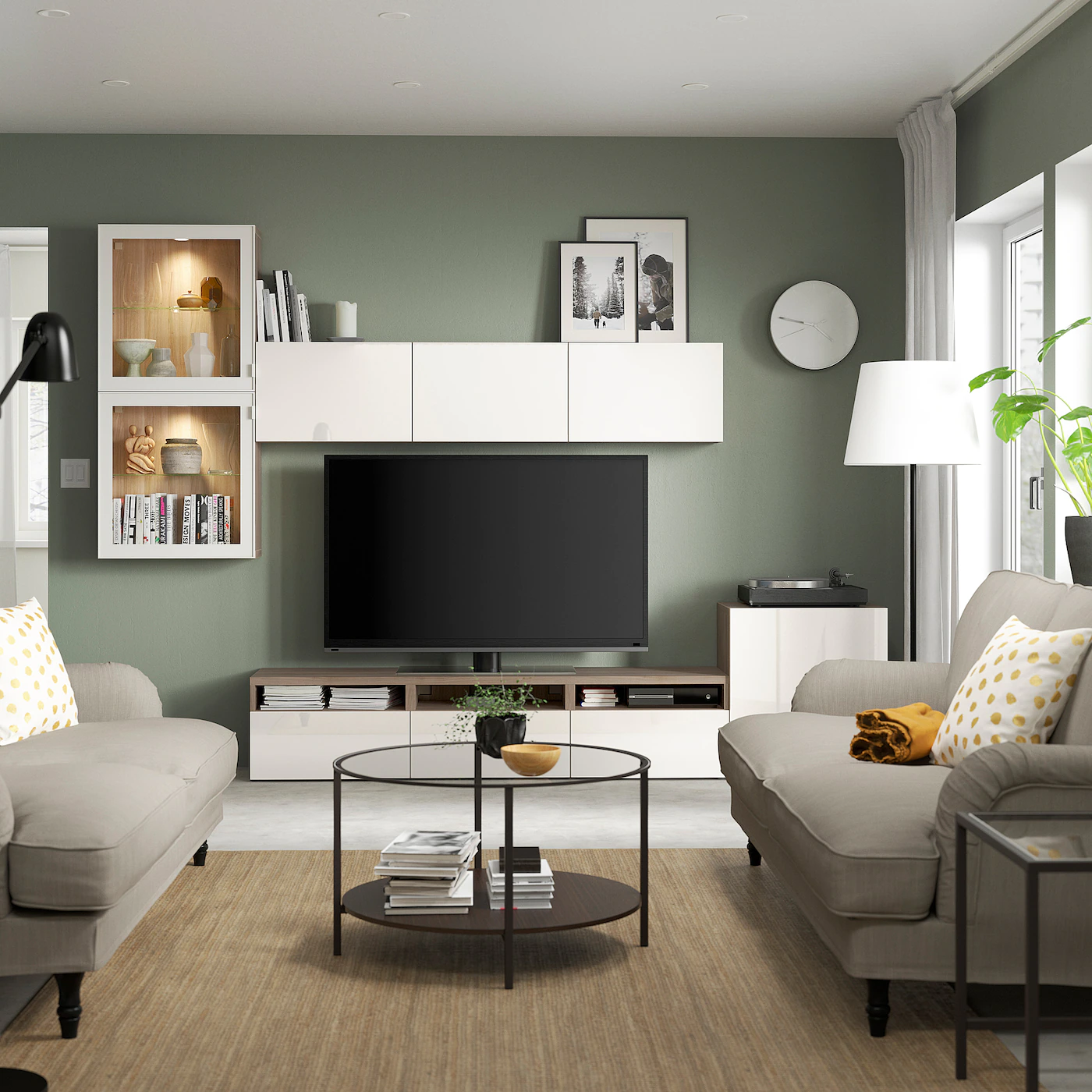 The cable outlet at the top lets cords run down smoothly into the TV bench. The drawers have integrated push-openers so that you can open them with just a light push. The drawers make it easy to keep your belongings organized. The shelves behind the doors give you even more storage space. The shelves are adjustable so you can customize your storage as needed. The space-saving wall cabinets make the most of the wall area above your TV. Optimize and organize your BESTÅ storage with boxes and inserts that you like.Material