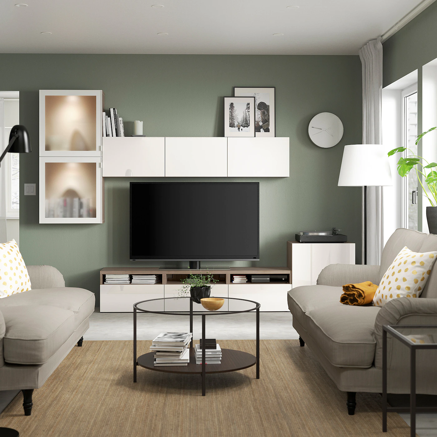 The cable outlet at the top lets cords run down smoothly into the TV bench. The drawers close silently and softly, thanks to the integrated soft-closing function. The drawers make it easy to keep your belongings organized. The shelves behind the doors give you even more storage space. The shelves are adjustable so you can customize your storage as needed. The space-saving wall cabinets make the most of the wall area above your TV. Optimize and organize your BESTÃ… storage with boxes and inserts that you like.Material
