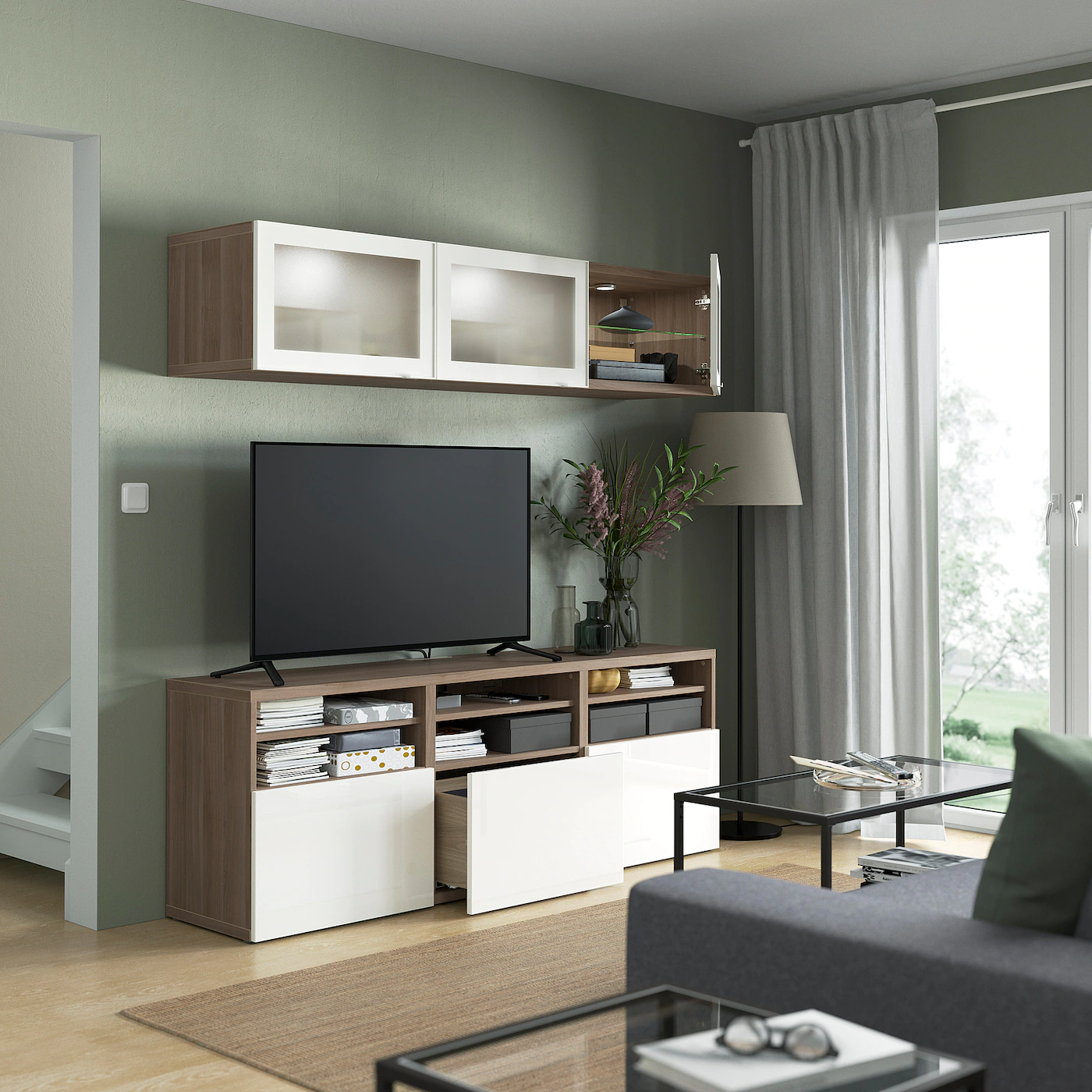 It’s easy to keep the cords from your TV and other devices out of sight but close at hand, as there are several cord outlets at the back of the TV bench. The cable outlet at the top lets cords run down smoothly into the TV bench. The drawer has an integrated push-opener, so you don’t need handles or knobs and it will open with just a light push. The shelves are adjustable so you can customize your storage as needed. The space-saving wall cabinets make the most of the wall area above your TV. Optimize and organize your BESTÅ storage with boxes and inserts that you like.Material