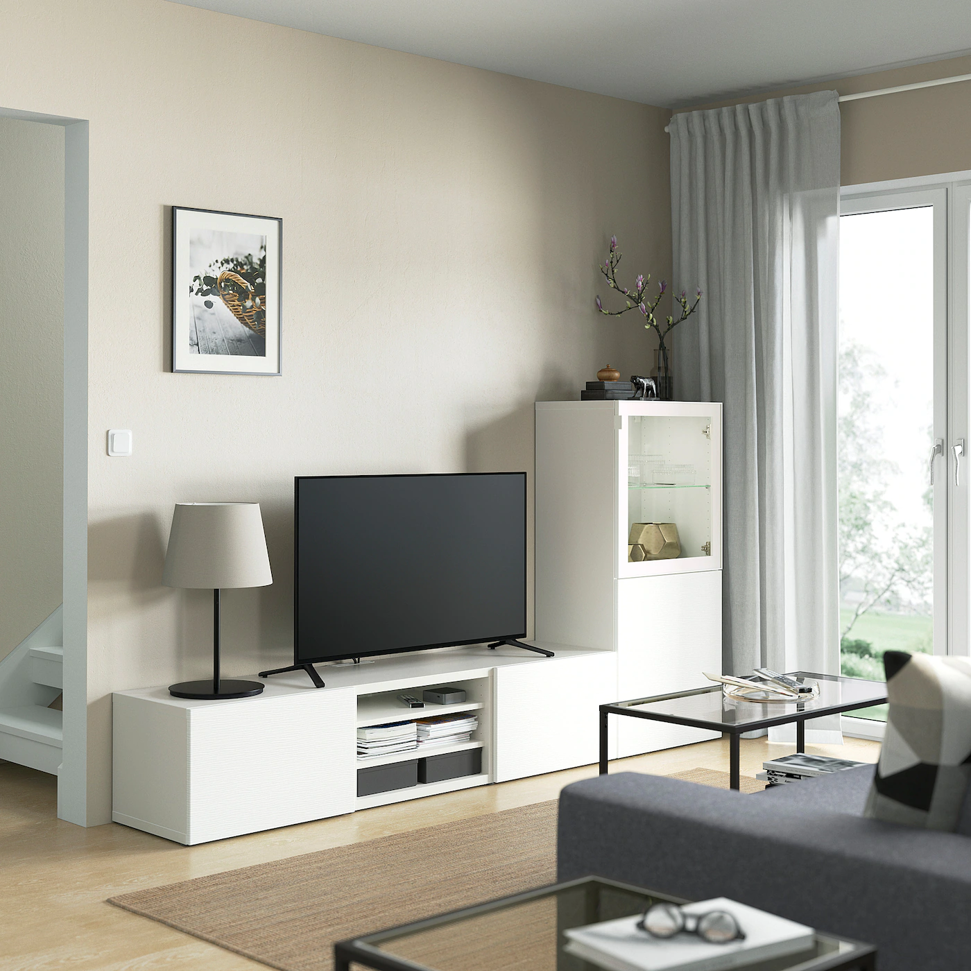 The cable outlet at the top lets cords run down smoothly into the TV bench. The drawers have integrated push-openers so that you can open them with just a light push. Two drawers make it easy to keep your belongings organized. The shelves behind the doors give you even more storage space. The shelves are adjustable so you can customize your storage as needed. Optimize and organize your BESTÅ storage with boxes and inserts that you like.Material