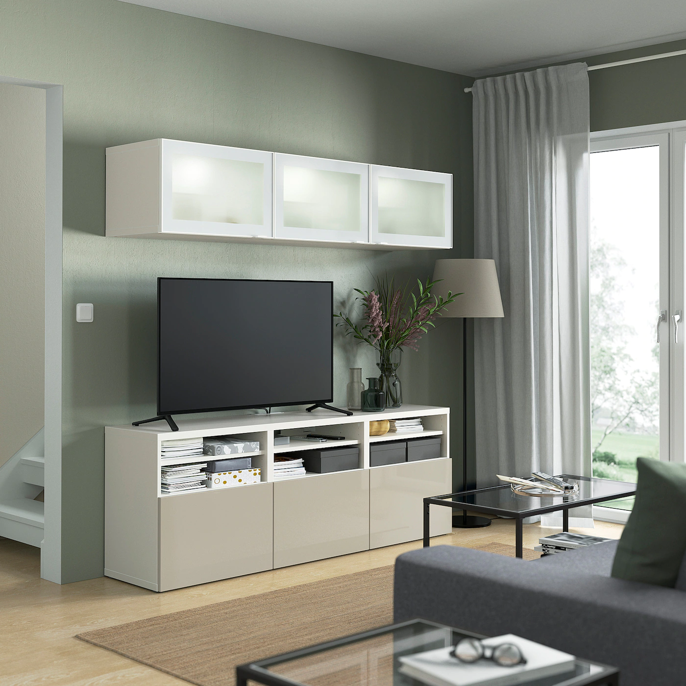 The cable outlet at the top lets cords run down smoothly into the TV bench. The drawer has an integrated push-opener, so you don’t need handles or knobs and it will open with just a light push. The shelves are adjustable so you can customize your storage as needed. The space-saving wall cabinets make the most of the wall area above your TV. Optimize and organize your BESTÅ storage with boxes and inserts that you like.Material