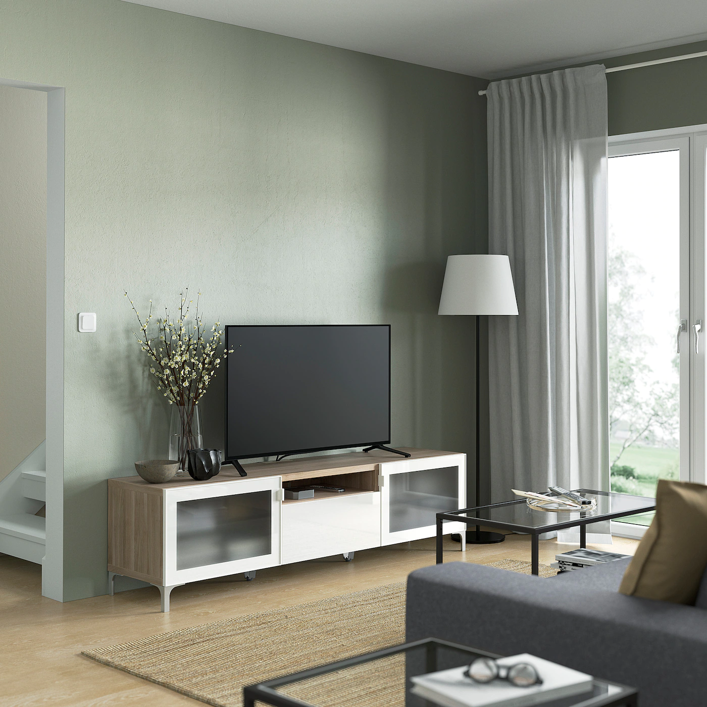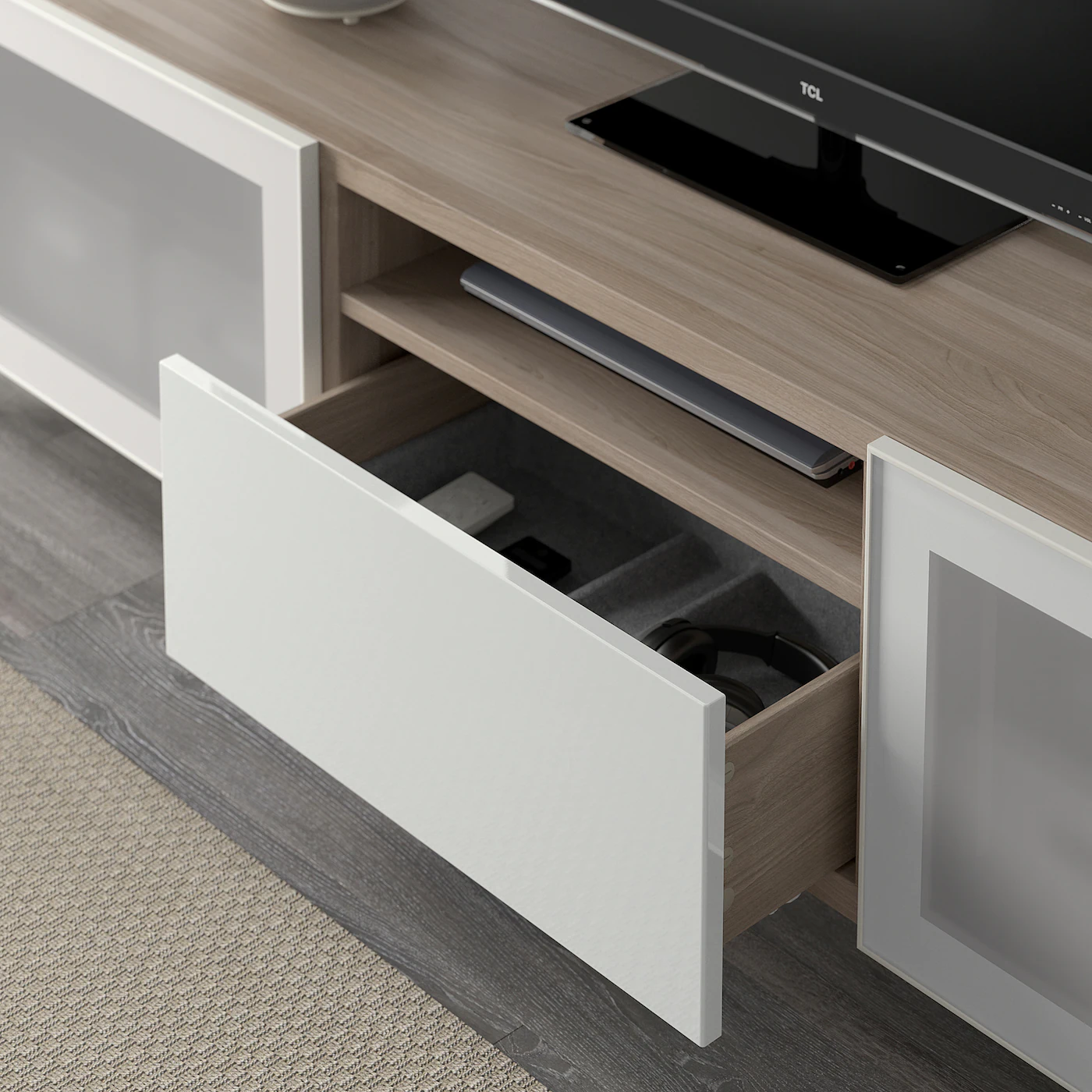 It’s easy to keep the cords from your TV and other devices out of sight but close at hand, as there are several cord outlets at the back of the TV bench. The cable outlet at the top lets cords run down smoothly into the TV bench. The drawer has an integrated push-opener, so you don’t need handles or knobs and it will open with just a light push. The drawer runners are adjustable so you can adjust the front both horizontally and in depth. You can control your electronic equipment with the doors closed, as the remote control works through the glass.Material