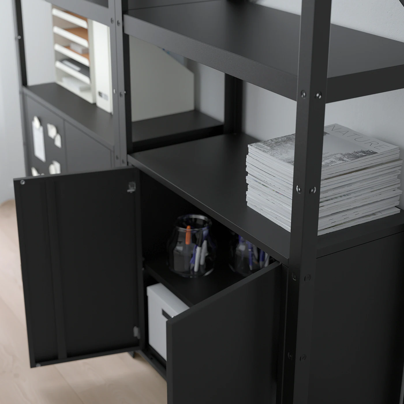 The shelving unit and cabinet is durable, easy to clean and protected from rust, as it is made of powder-coated galvanized steel.