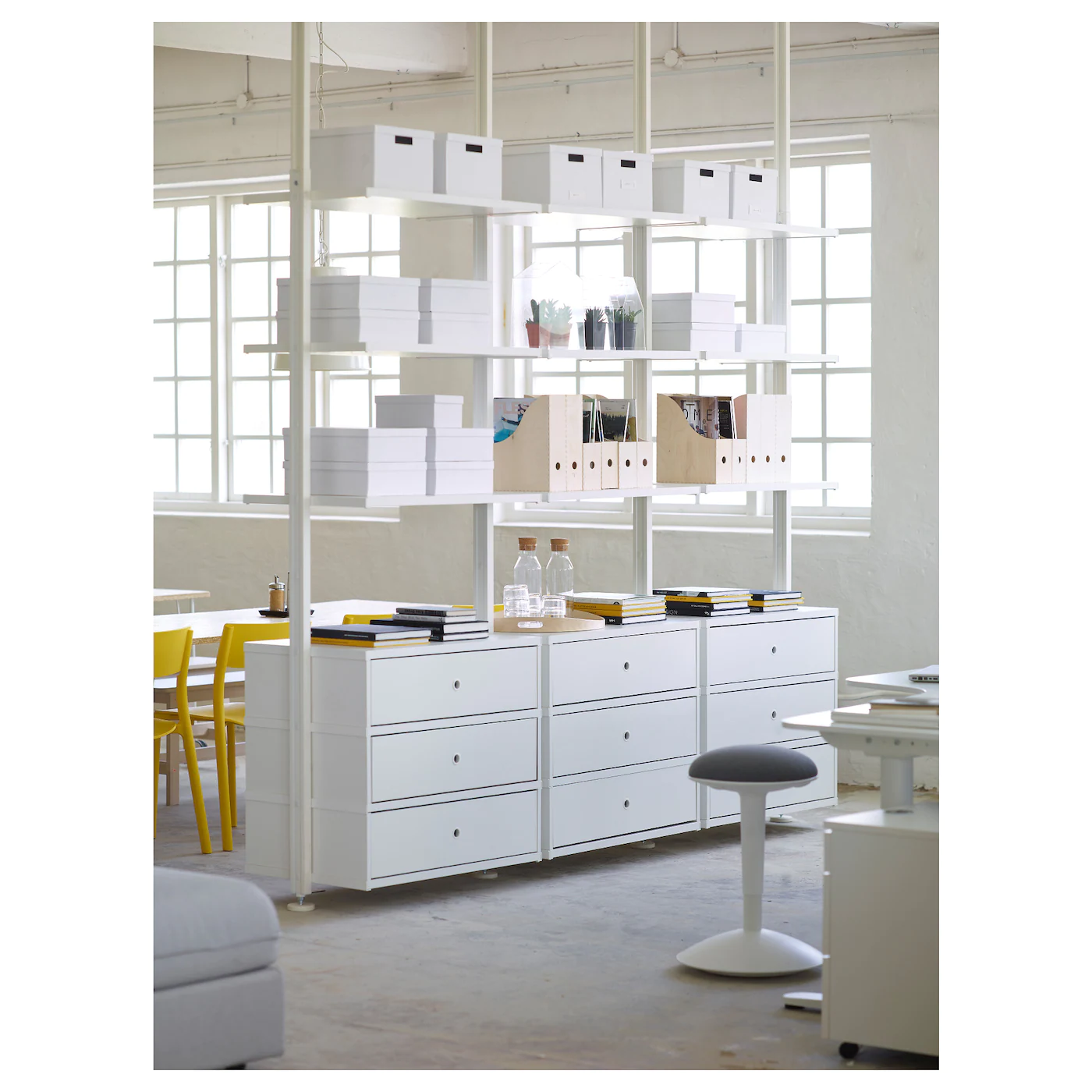 Adjustable shelves make it easy to customize the space according to your needs. Drawers with integrated dampers close slowly, silently and softly. You choose if you want to place the open storage solution against a wall or use it as a room divider since the post attaches to the ceiling. Height adjustable 87⅜”-137¾”- allows you to utilize the entire ceiling height.Material
