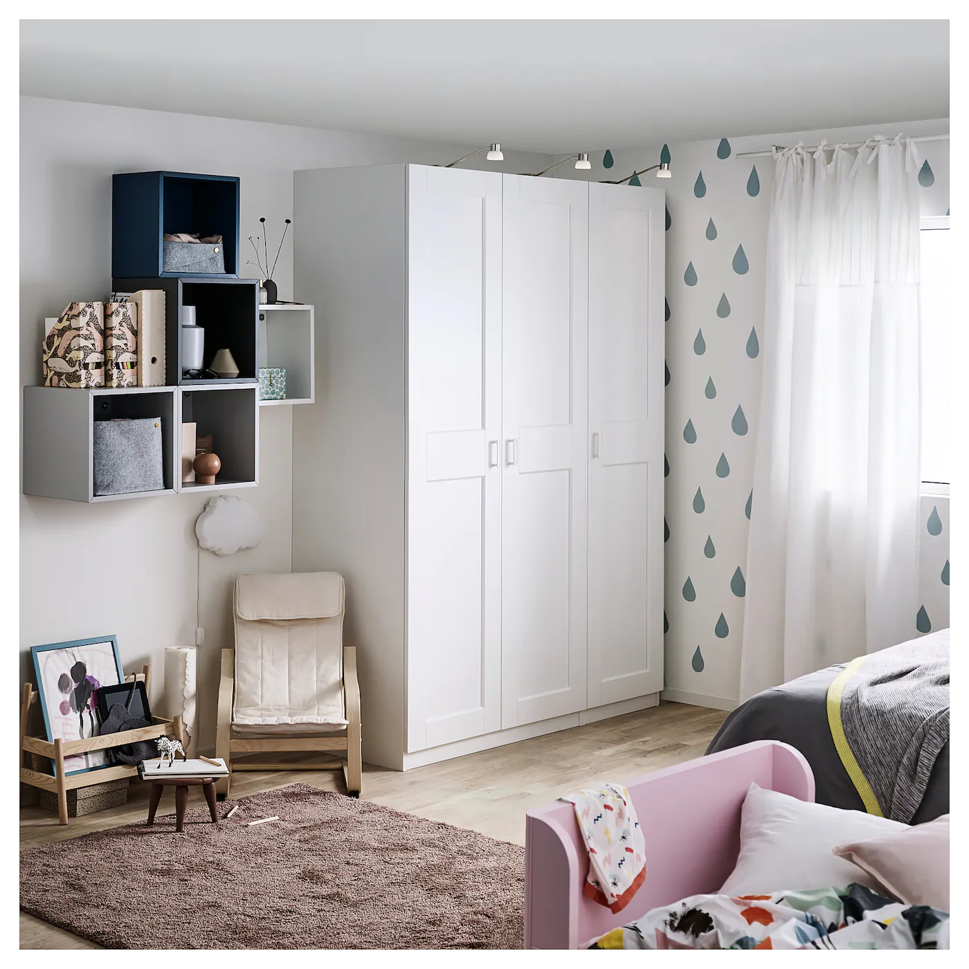 The door can be hung to open either right or left. The two panel door has chunky, wide frames with a bevelled edge on the inside. We’ve kept the details to a minimum and focused on clear lines. GRIMO is covered in a white foil on both the front and back side, matching perfectly with your white PAX wardrobe frame.Material