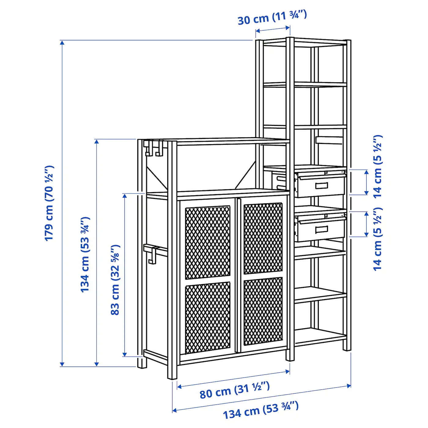 The cabinet fits IVAR storage system, but you can also have it freestanding. To minimize the amount of residual waste, small holes are punched in the metal which is then stretched until it eventually becomes a mesh net. The mesh net is produced according to the “zero waste” principle, which involves minimal waste during production and that the material should be reusable after the product is used. IVAR storage system is made of sustainably-sourced solid pine – a renewable natural material that only gets more beautiful over the years. You can easily customize the storage combination to your needs by completing with hooks, drawers and more shelves or cabinets from IVAR storage system. Sold separately.Material
