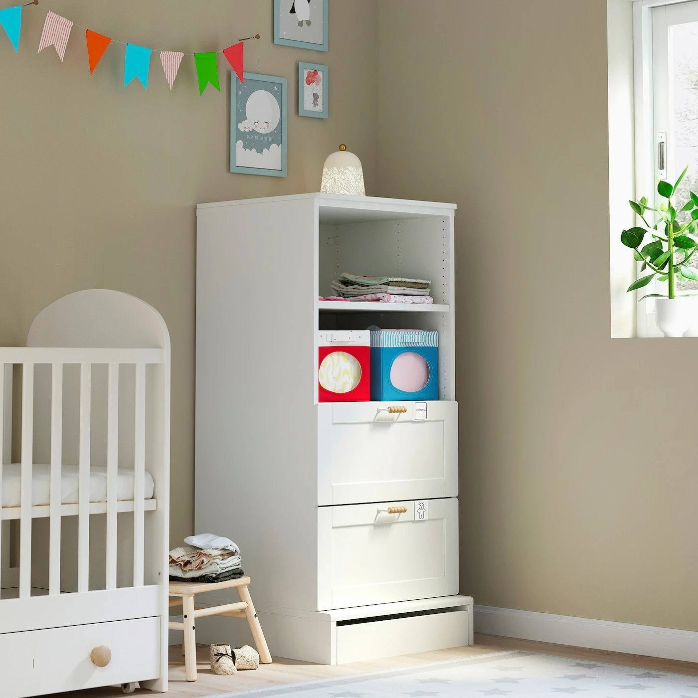 Perfect height for small children. They can easily reach and find things on their own. Stands firmly in place on uneven floors thanks to the included adjustable feet. To save on our natural resources and make use of as much of the tree as possible, we have used sawmill leftovers and scrap wood in the particle boards for SMÃ…STAD.Material