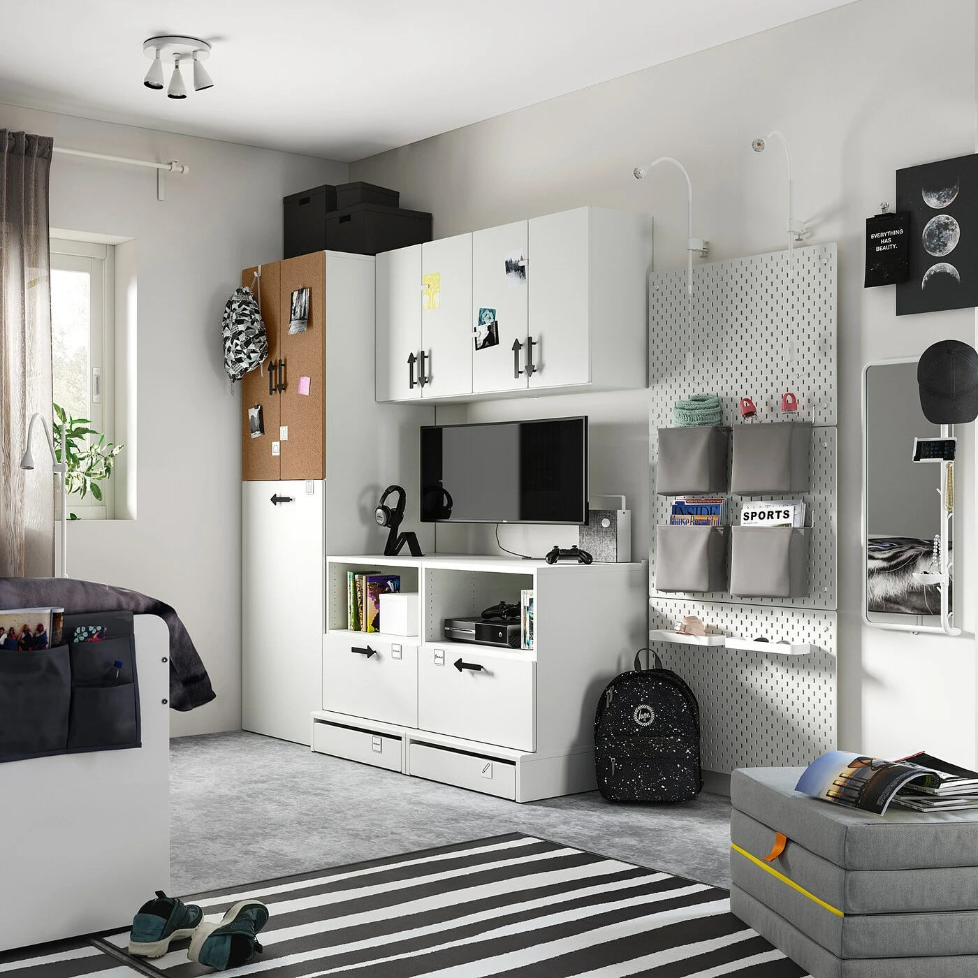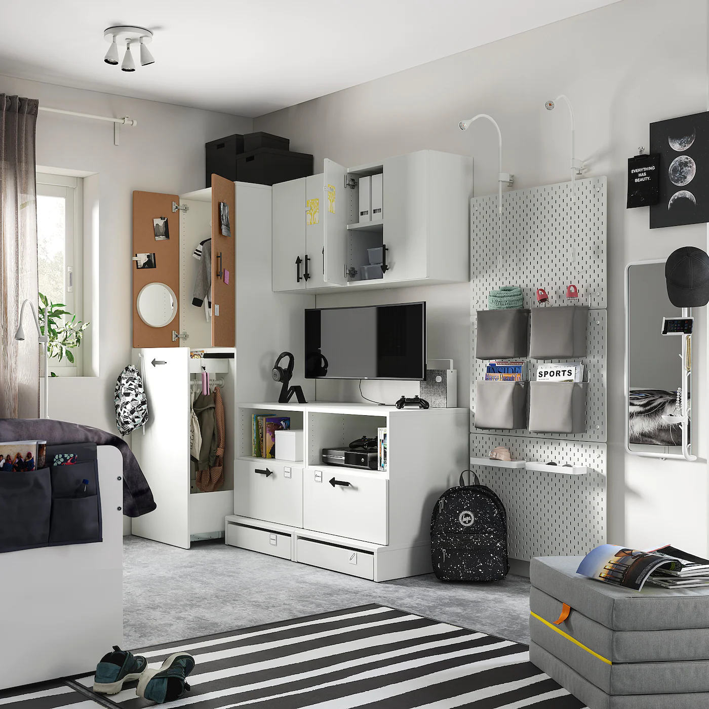 This storage solution can be used by your child for many years since you can move the interior as your child’s needs change. On the cork doors your child can hang their favorite pictures and important notes – without having to make holes in the wall. With hooks on the inside and outside, it’s easier to hang clothes, backpacks and other things that would otherwise end up in a pile on the floor. The doors have soft-closing hinges which make them close softly and quietly – even after a heated argument. At the bottom of the pull-out storage there is a box for everything that needs to be quickly cleared away.Material